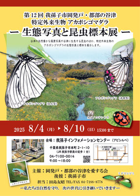 谷津(我孫子市岡発戸・都部)の自然豊かな風景写真や谷津に生息する昆虫の他、特定外来生物のアカボシゴマダラの生態写真と標本を展示します。