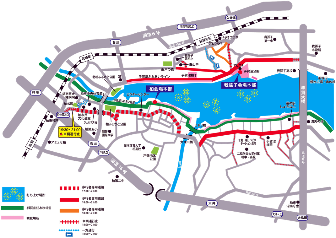 ・我孫子市・柏市とも有料席は完売しました。手賀沼ふれあいライン(手賀沼横丁付近)での観覧がおすすめです!